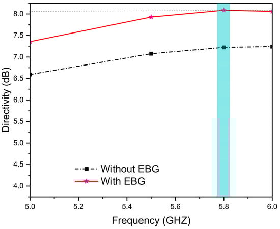 In addition, it has a higher directivity of 8.04 dBi compared to 7.24 dBi of the conventional antenna intended resonance frequency (blue shadow), as shown in Figure 10, confirming the effectiveness of the EBG structure in focusing radiated energy.