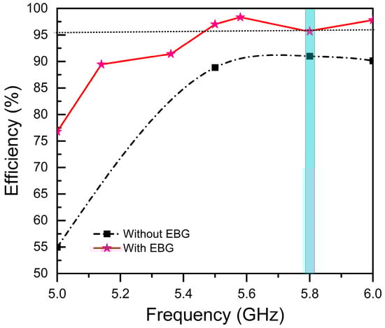 However, radiation efficiency improves significantly, rising from 90.9% for a conventional design to 96.7% for an EBG-based antenna at (blue shadow) resonance frequency, as illustrated in Figure 11. The 6.3% increase in efficiency is attributed to the suppression of surface waves and substrate losses, ensuring more power is radiated rather than dissipated.