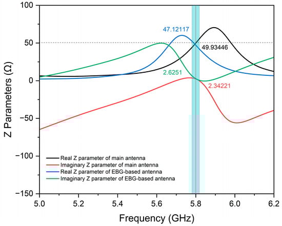 Impedance matching is fundamental in radio frequency (RF) and antenna design. To achieve optimum performance, there must be a match between the antenna’s input impedance (Zin) and the port impedance, ideally 50 Ω. Simulations were conducted for each antenna design, and the input impedance (Zin) was extracted. The simulated value of the conventional antenna was 49.93 + j2.34 Ω, whereas the EBG-based antenna was 47.12 + j2.63 Ω at (blue shadow) resonance frequency. These values approximate the desired 50 Ω matching impedance with relatively small or zero imaginary parts, as indicated in Figure 12. The results verified that all the antenna structures are well matched to the port, facilitating efficient power delivery and low reflection losses.