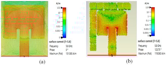 Surface current of proposed antennas: (a) without EBG; (b) with EBG.