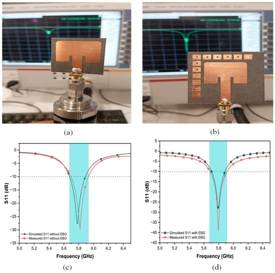 Figure 14 presents a comprehensive comparison between conventional and EBG-integrated antenna prototypes through both physical implementations and electromagnetic performance analysis. The upper panels display the fabricated prototypes, with Figure 14a showing the baseline antenna design and Figure 14b demonstrating the modified version incorporating an EBG structure. The lower panels provide quantitative performance evaluation, where Figure 14c plots the reflection coefficient (S11) for the conventional antenna and Figure 14d shows the results for the EBG-enhanced version, each comparing simulated predictions with actual measurements. Notably, the experimental results exhibit exceptional agreement with simulations, deviating from the typical frequency shifts often observed in such comparative studies. The EBG-integrated antenna demonstrates markedly improved performance, as evidenced by a substantial reduction in the reflection coefficient magnitude. This close correlation between theoretical modeling and practical measurements not only validates the simulation approach but also confirms the effectiveness of the EBG implementation in enhancing antenna matching characteristics. The findings underscore the EBG structure’s capability to optimize antenna performance while maintaining excellent consistency between design predictions and real-world operation.