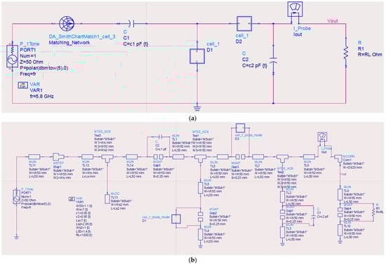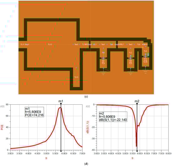 The proposed EBG antenna to be integrated to a RF energy harvester circuit comprises an impedance matching network, voltage multiplier rectifier, and output filtering stage, as illustrated in Figure 15. The input matching network employs a microstrip line (width (Ws) of 7.0 mm and length (Ls) of 7.0 mm) associated with an open-circuit stub (width (Ws2): 1.0 mm, length (Ls2): 2.95 mm) to transform the 50 Ω antenna impedance to the rectifier’s complex input impedance, achieving a reflection coefficient of below −22 dB. Two Schottky diodes (parasitic capacitance: 0.25 pF, parasitic inductance: 2 nH) were incorporated in the design. The output stage incorporates a simple low-pass filter that is interconnected to minimize ripple voltage across the load. Full-wave EM co-simulation in ADS Momentum accounted for layout parasitics, including substrate coupling effects and microstrip discontinuities. The optimized design demonstrated a peak power conversion efficiency (PCE) of 74.2% at 5.8 GHz for an input power of 5 dBm, with >70% efficiency maintained across a 150 MHz bandwidth, as shown in Figure 15.