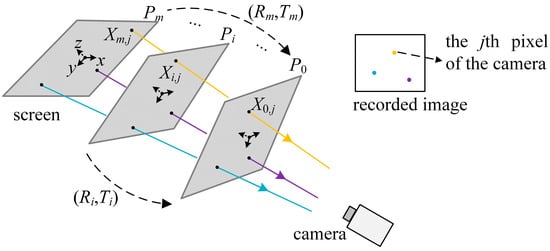Illustrated in Figure 1, in the posture Pi (i = 0, …, m) with the rotation matrix Ri and the translation vector Ti (the dashed arrows in Figure 1) to P0, the screen with a height of h and a width of w displays the phase-shifted [] horizontal and vertical fringe patterns with the fringe orders N2, N2−1, N2−N selected by the optimum fringe frequency method []. From the recorded images of the camera, the extracted phase provides the dense correspondence between the pixels of the camera and the screen. For the jth (j = 1, …, n) camera pixel with the recorded horizontal and vertical phase values and in Pi of the screen, the corresponding screen pixels Xi,j (x, y, 0) are spatially collinear, where