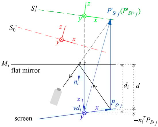 In the CS of the screen, the distance between the flat mirror and the origin of the screen CS along the normal direction ni of the flat mirror is denoted as di. In the CS of the screen, recorded by the jth camera pixel, a point PS,j is located at a distance d to Mi along ni. As a virtual image of PS,j, the point is denoted as P′S,j and P′Si′,j in the CSs of the screen and Si′, respectively. According to the geometry of the mirror reflection, there are