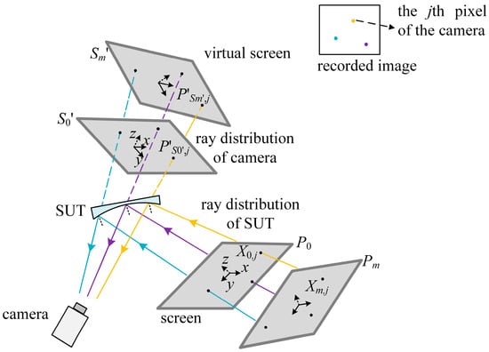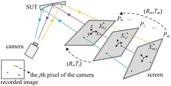 The second step of the calibration is to solve the vision ray distribution of the SUT. The vision rays are between the SUT and the screen. Illustrated in Figure 3, in which a SUT is measured after the first calibration step, the camera records the reflected fringe patterns by the SUT while the screen displays the fringe patterns in several different postures Pi (I = 0, …, m), and P0 maintains the posture in the first step in Section 2.2.