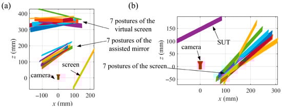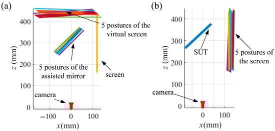 To test the proposed VRC-based mono-PMD, some simulated experiments were carried out. As SUTs, a specular cylinder and a specular ball with a radius of 200 mm are measured by a simulated system of the mono-PMD. In the calibration of the system, the assisted flat mirror and the screen are moved into five different postures. The ideal fringe patterns captured by a simulated camera based on the ideal pinhole model are generated with the relative positions among the screen, the camera, and the assisted flat mirror or the SUTs, as depicted in Figure 5. Figure 5a illustrates the five postures of the assisted mirror in the calibration of the camera; Figure 5b illustrates the five postures of the screen in the calibration of the SUT.