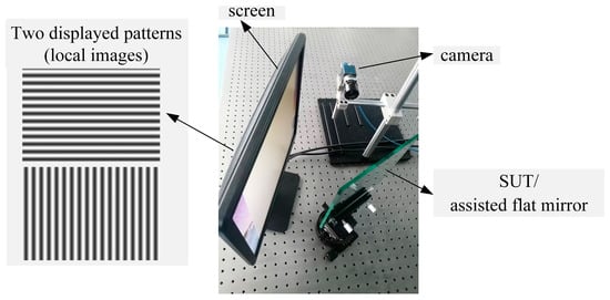 The deflectometric system consisted of a screen and a camera, as depicted in Figure 7. The camera (manufacturer: DAHENG IMAGING, Beijing, China; model: MER2-503-36U3 M; resolution: 2048 × 2448; pixel (px) interval: 3.45 μm) matched a standard prime lens (manufacturer: AZURE Photonics, Fuzhou, Fujian province, China; model: AZURE-1614MM; focal length: 16 mm). In the vertical and horizontal directions of the screen, it (manufacturer: Dell Technologies, Round Rock, Texas, USA; model: E1715S; resolution: 1280 × 1024; pixel interval: 0.264 mm) displayed the phase-shifted cosinoidal fringe patterns with optimal fringe orders of 144, 143 and 132.