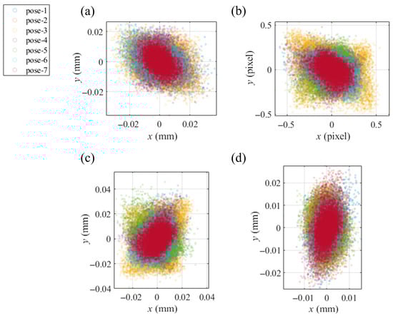 Distributions of the reprojection errors in separate calibrations, where different colors indicate the errors associated with the different postures of the assisted mirror. Reprojection errors of (a) the VRC-based calibration of the camera in Section 2.2, (b) the PHC-based calibration of the camera on the image sensor, (c) the PHC-based calibration of the camera reprojected to the screen, (d) the VRC-based calibration of the SUT in Section 2.3.
