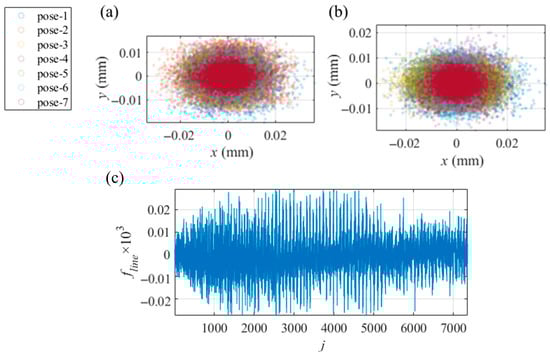 Distribution of the reprojection errors in the integrated calibration, where different colors indicate the errors associated with the different postures of the assisted mirror and the screen. Distribution of the errors of (a) the camera, (b) the SUT, (c) the residual fline,j.