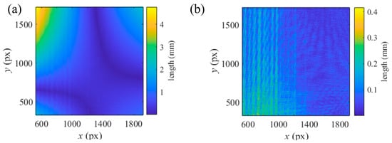 With the shape deviation from an ideal plane of under 1 μm, a flat mirror in 7 different postures covered the view of the camera and reflected the displayed fringe patterns, which were recorded by the camera. Solved by the techniques of phase extraction, the absolute unwrapping of vertical and horizontal phase maps was extracted from the recorded patterns. From the phase maps, Equation (1) solved the coordinates of the recorded points in the CSs of the virtual screens. In the central region, with 1600 × 1400 px phase maps, 8876 integer pixels, with an even interval of 15 px, were selected to calibrate the camera with the method in Section 2.2, obtaining vdi, RS0′ and TS0′ as the initial values for the integrated calibration. The iteration processes were performed with a computer (manufacturer: Dell Technologies, Round Rock, Texas, USA; model: OptiPlex 7000; CPU: i7-12700; RAM: 16 GB) and the software MATLAB R2022b Update 10 (9.13.0.2698988), spending 8 iterations and 3.4487 s. With the mean value of [10−16, 10−16] mm and the std of [0.0074, 0.0065] mm, the distributions of the residual calibration error and are illustrated in Figure 8a. With the same operation of the hardware, the traditional PMD calibration based on a pinhole camera calibration (PHC) obtained the intrinsic parameters of the camera and the relative postures among the screen, the camera and the assisted mirror.