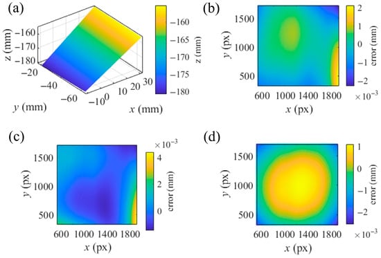The length of the common vertical line between the camera ray and the SUT ray, with the results of the separate calibrations and the integrated calibration, corresponding to each integer camera pixel, is depicted in Figure 11. With the integrated calibration results, the length of the common vertical lines was reduced from the mean value of 0.8086 mm and the std of 0.8443 mm with the separate calibration results to the mean value of 0.0498 mm and the std of 0.0468 mm. With the slope distribution solved by the ray distributions and the x, y components of the middle points, the SUT was integrally reconstructed in the CS of S0′. Figure 12 presents the residual errors in the z direction of the CS of S0′ for each integer pixel of the camera, associated with the plane fitting of the reconstruction. Reconstructed with the results of the separate calibrations and the integrated calibration, the 3-D reconstructions were fitted by planes with root mean errors (rmses) of 8.6356 × 10−4 mm and 5.7982 × 10−4 mm, respectively. The integrated calibration effectively improves the accuracy of the calibration and the reconstruction. To compare the reconstructions with the calibrations based on the VRC and the PHC, the PHC-based PMD calibration algorithm [] was conducted with two parameters of tangential distortion and three parameters of radial distortion. A modified MPMD [] approach was implemented using a cubic B-spline surface with a knot interval of 70 px to model the SUT, along with the results from the PHC-based calibration. This modified MPMD did not involve optimizing the parameters related to the camera and screen positioning. The reconstruction achieved by the modified MPMD was fitted with a plane with an rmse of 7.0182 × 10−4 mm towards the fitted plane, as shown in Figure 12d. From the reconstructions of the SUT, the VRC-based calibration and reconstruction are more reliable than those of the PHC.
