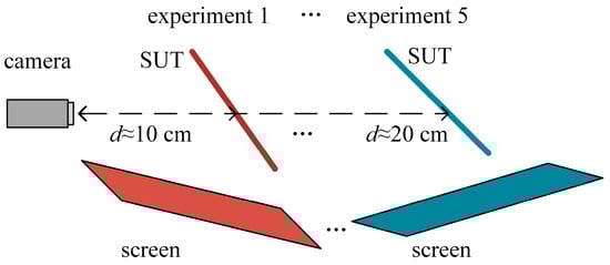 To evaluate the reliability of the VRC-based integrated calibration, five experiments were carried out with the distance d between the planar SUT and the camera varying from 10 cm to 20 cm in increments of 2.5 cm (Figure 13). Reconstructed with the results of the VRC-based integrated calibration (IC) and separate calibrations (SC), the rmse and the peak–valley value (pv) of the residual errors associated with the plane fitting of the reconstructions are summarized in Table 1. The data presented in the table demonstrates that the VRC-based integrated calibration yields more reliable reconstructions compared to the separate calibrations, while also exhibiting a high degree of repeatability.