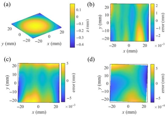 After the separate calibration of the camera, a planar mirror with a size of 45 mm × 40 mm as an SUT was measured. The screen displayed the fringe patterns in 7 different postures, while the first posture remained the same as in the calibration of the camera. The SUT was fixed to reflect the patterns that were recorded by the camera. Using the method in Section 2.3, the identical integer pixels from the calibration of the camera were employed to calibrate the SUT, obtaining the relative postures Ri and Ti between the postures of the screen, which served as the initial values for the integrated calibration. The processes took 10 iterations and 5.6343 s. The error distribution in calibrating the SUT is illustrated in Figure 8d.