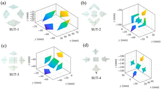 To further test the performance of the proposed VRC-based mono-PMD, four SUTs with the coplanar separate flat mirrors illustrated in Figure 15 were measured. The slope distributions of the SUTs were solved by the VRC-based integrated calibration. Describing the height increment of a continuous surface, the reconstruction of every separate mirror with a mean height of zero was conducted by the integral reconstruction algorithm []. Every reconstruction of an individual mirror was adjusted based on the mean distance between the middle points and the relative reconstruction corresponding to the same integer pixels. The reconstructions of the SUTs were, respectively, fitted with planes with rmse 0.0029 mm, 0.0066 mm, 0.0053 mm, and 0.0112 mm towards the fitted planes. The proposed VRC-based mono-PMD reaches higher precisions than the PHC-based reconstruction method [] in the reconstruction of the separate mirrors.