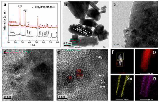 (a) XRD spectra of Pt/SnO2; (b,c) TEM and (d,e) HRTEM of Pt decorated SnO2; (f) element mapping of O, Sn, Pt of Pt/SnO2 nanotubes from the orange box.