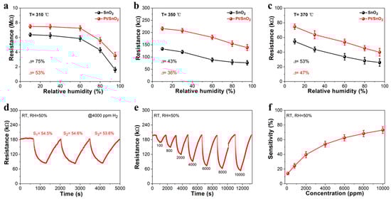 Humidity effect based on Pt/SnO2 sensors synthesized at (a) 310 °C; (b) 350 °C; (c) 370 °C; Gas-sensing properties based the optimized Pt/SnO2 sensor (350 °C): (d) Repeatability; (e) dynamic sensing curve for H2 detection at room temperature; (f) sensitivity vs. concentration.