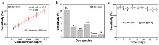 (a) The linear relationship of sensitivity vs. concentration; (b) selectivity towards gases at 100 ppm; (c) long-term stability for H2 sensing at room temperature.