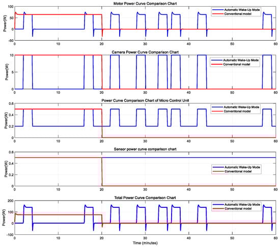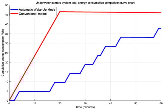 The operational mode of underwater pan-tilt systems has undergone a technological evolution from experience-driven approaches to intelligent perception. The traditional timed operation mode relies on marine biologists’ long-term observations of diurnal organism rhythms in target sea areas. It establishes fixed working periods through statistical modeling and uses timers to control the pan-tilt system for scanning observations and video collection within preset intervals. Conversely, the automatic wake-up mode constructs a biological activity probability model by fusing multiple sensor modalities (environmental perception, biological recognition, optical detection, etc.). Upon detecting biological entities, this mode triggers the pan-tilt system’s transition from a dormant to an active state. According to one study in the literature [], the nocturnal activity frequency of coral reef fish ranges approximately from 7 to 10 times per hour. Considering the variable occurrence frequency of underwater organisms across environments, assume a specific scenario where a target organism appears eight times per hour within the camera’s operational zone. Thus, in automatic wake-up mode, the camera activates eight times hourly, operating for 2 min per activation. In timed mode, the camera operates continuously for 20 min within a designated period. Using Table 1 and Equation (2), the unit time energy consumption for both modes can be derived. The component power consumption and cumulative energy expenditure per unit time for both operational strategies are depicted in the accompanying figure.