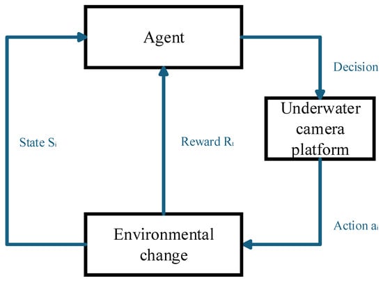 The Q-learning algorithm is an unsupervised reinforcement learning algorithm, and it is regarded as one of the commonly used techniques for developing energy management strategies. Through the interaction between the agent and the environment, it aims to understand the value of taking specific actions in a given state. Based on the action values and rewards, it is continuously updated over time to maximize the cumulative rewards [,]. The theoretical foundation is built upon the Markov Decision Process (MDP), a fundamental concept in reinforcement learning that provides a principled mathematical framework for modeling the environment as an MDP []. A stochastic process is said to possess the Markov property if and only if the state at any given moment depends solely on the state of the previous moment, which can be mathematically expressed as (where represents the current state (at time step t); indicates the resulting next state). In other words, the current state serves as a sufficient statistic for future states—the next state is determined exclusively by the current state and remains unaffected by historical states. The MDP is typically described by the tuple (S, A, P, R, γ), where S represents the state space; A denotes the action space; P is the state transition probability; R stands for the immediate reward function; γ is the discount factor []. In energy management applications, MDPs effectively model system states (e.g., energy storage levels, demand patterns) and controllable actions (e.g., power dispatch, load scheduling) through either discrete formulations suitable for equipment switching scenarios or continuous representations requiring function approximation for precise power allocation. Researchers typically solve these models using value iteration algorithms that recursively apply Bellman equations or policy optimization methods that directly refine control strategies, with solutions often addressing challenges like partial observability through POMDP extensions or multi-agent coordination via decentralized MDP variants. The following Table 2 provides explanations of the parameters related to the MDP decision-making framework for underwater pan-tilt systems.