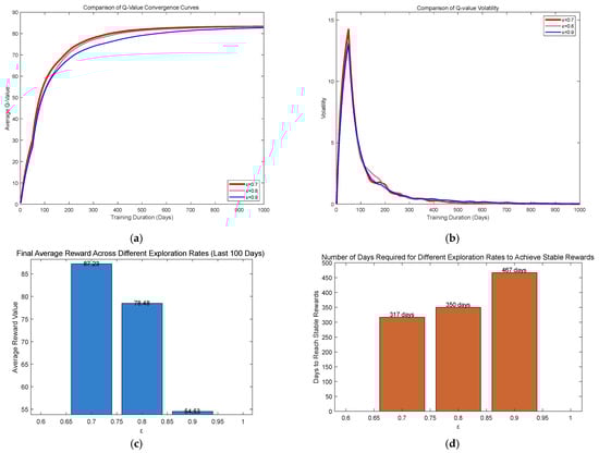 Comparison of different exploration rates. (a) Comparison of Q-value convergence curves. (b) Q-value oscillation analysis across varying exploration rates. (c) Final average reward across different exploration rates. (d) Days to reach stable rewards.