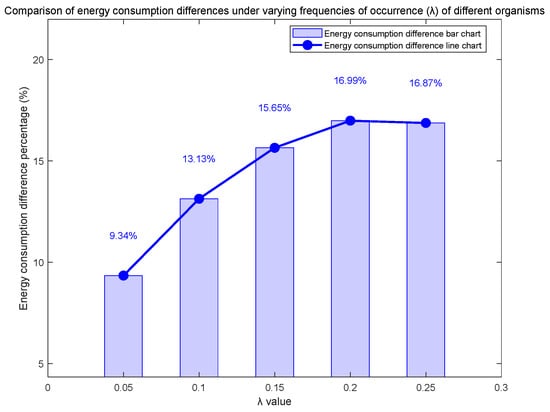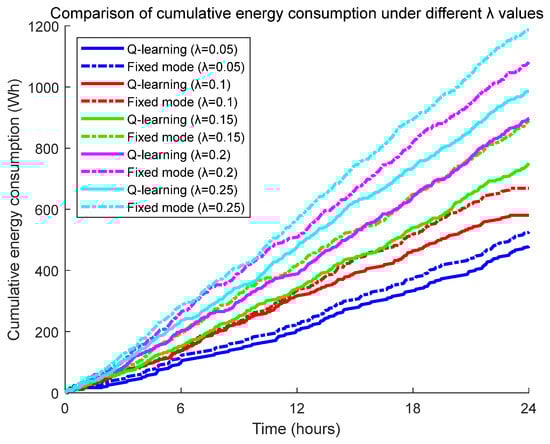 To further investigate the energy optimization performance of the Q-learning-based dynamic control strategy under varying biological appearance frequencies, this study employs exponential distributions with different parameters to simulate gradient changes in biological occurrence rates. Through a 24 h continuous monitoring experiment, we systematically analyze the cumulative energy consumption trends of the pan-tilt system, with a focus on examining the dynamic differences in energy consumption between the two operational modes caused by variations in biological appearance frequencies, as illustrated in Figure 11 and Figure 12.