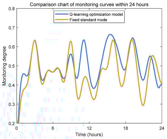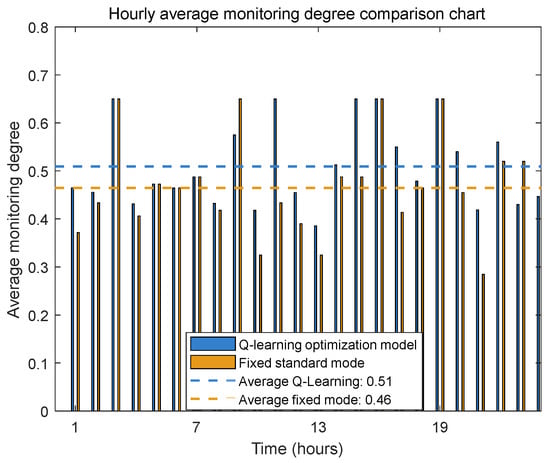 Comparative analysis of the monitoring performance between the two modes (as illustrated in Figure 13 and Figure 14) reveals that the Q-learning dynamic optimization mode achieves marginally superior overall monitoring quality compared to the fixed standard mode, with an approximate five-percentage-point improvement in average monitoring intensity.