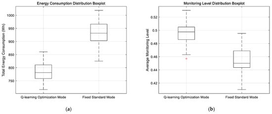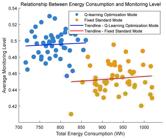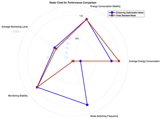 The analysis of the presented figures shows that both monitoring modes achieve slightly better performance with higher energy consumption. However, the Q-learning-optimized mode outperforms the fixed standard mode in overall performance. Under the same monitoring level, the Q-learning mode consumes significantly less energy. This advantage comes from its intelligent algorithm that dynamically optimizes resource allocation to reduce energy waste. Meanwhile, it maintains high monitoring accuracy without sacrificing coverage. The radar chart clearly illustrates the Q-learning mode’s advantages across key metrics. Besides energy efficiency and monitoring accuracy, it also shows good stability with balanced performance in all indicators. Both modes maintain stable trends in their energy–performance curves. This stability confirms that the Q-learning optimization provides reliable controllability and predictability without causing significant performance fluctuations.