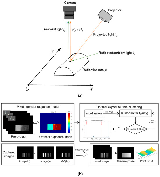 Optical measurement in industrial visual inspection utilizes light-based technologies to capture, analyze, and quantify the visual features of products or components, such as dimensions, surface defects, and color consistency, thereby enabling non-contact, high-precision, and efficient quality control in manufacturing processes [1,2,3,4]. Fringe projection profilometry (FPP) is a commonly used method for 3D measurement [5,6]. Compared with other methods such as stereo vision [7,8] and line laser scanning [9,10], FPP has the advantages of high accuracy and fast speed [11]. Its main technical process includes coded projection [12], camera acquisition, system calibration [13], phase solving, and point cloud reconstruction [14,15,16,17,18,19]. In pursuit of enhancing measurement precision and operational efficiency, researchers have dedicated their efforts to optimizing different aspects, including projection devices [20,21,22,23], calibration methods [24,25,26], phase recovering algorithms [15,16,27,28], and deep learning [5,28,29,30]. However, when performing 3D measurements of objects in real production, the measurement effectiveness of structured light systems is often affected by the optical properties of the surface of the object being measured [31]. In general, high-dynamic-range (HDR) objects are those with a wide range of surface reflectance variations, such as rusty, oily, or shiny surfaces, which result in a dynamic range that exceeds the ability of traditional low-dynamic-range sensors to capture images [32,33]. In industrial inspection, they refer to workpieces with surfaces that are under-modulated and have oversaturated pixels in the captured image due to differences in the material.