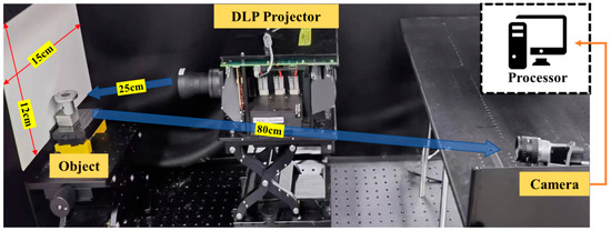 The system shown in Figure 3 consists of a DLP (digital light processing) projector (the Texas Instrument PRO6500-RGB-235 with resolution of 1920 × 1080 and a refresh rate of 247 fps @ 8 bit) and a camera (the Basler aca 2040–120 um grayscale camera, with a resolution of 2048 × 1536 and a frame rate of 119 fps). Compared to MEMS projection devices [49,50], DLP projectors offer higher precision and easier operation, making them suitable for projecting different grating patterns. The target is placed at a distance of approximately 930 mm from the camera. For the measurement tasks detailed in the following, we adopted a unidirectional structured light calibration method for system calibration [51]. We chose a six-step phase-shifting strategy with a stripe frequency of 32. The structured light patterns were projected sequentially along the vertical direction, and there were seven complementary Gray code projection patterns (five complementary-Gray-coded patterns and two pure white-and-black patterns).