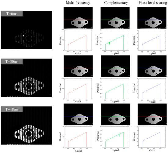 The phase resolution results corresponding to the different methods at three exposure times, short, medium, and long, are shown in Figure 5. On the left side is the acquired image of the high-frequency streak projection, and on the right side is the absolute phase map and the line graph plotted along the horizontal axis by selecting a certain row of phase values. It can be seen that with a short exposure time of 6 ms, the acquired image is overall darker and basically free of intensity saturation. And as the exposure time is prolonged, the overexposure phenomenon on the surface of the measurement object becomes more and more obvious, mainly appearing in the middle of the workpiece’s inner and outer axial ring part, with a strong reflection phenomenon. In terms of the absolute phase solution, both the step-by-step expansion and the complementary Gray code expansion based on phase order sharing can successfully expand the parcel phase in the low exposure case, while the absolute phase solved by the complementary Gray code method has a phase mutation, which indicates that there is an error in this part of the step-by-step expansion, since the exposure time is too short, which results in the black-and-white edge transition segment in the acquired Gray code projection image during binarization. In the case of medium exposure time, all three methods can correctly solve the absolute phase. It can be seen that intensity saturation occurs in many regions on the surface of the object in the case of long exposure time, and the phase solving effect of the complementary Gray code method based on phase order sharing is still better than that of the traditional complementary Gray code method, which proves that the phase order sharing method reduces the projected image and proves the selection of a group of Gray codes with appropriate exposure for decoding. The effect will also be better than a group with too weak or too strong exposure.