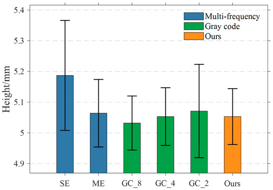 The measurement results are recorded as shown in Figure 9. It can be seen that, without the use of multi-exposure fusion, the single-exposure method SE measurement error is the largest, and the data fluctuation is large. The error is the smallest with the use of eight groups of equal-step exposure time fusion for the phase-shifting method and the phase order sharing complementary Gray code for phase resolution of GC_8. For this paper’s proposed method, the use of two groups of exposure time under the phase-shifting image for the fusion, the measured value is 5.053 mm, the error is 0.053 mm, and the standard deviation is 0.091 mm. The error and standard deviation are reduced by 25.4% and 40.1%, respectively, compared with the GC_2 method using two groups of images, and the measurement accuracy is basically the same as that of GC_4 using four groups of images and ME using eight groups of images. However, the method in this paper reduces the number of images used from 31 to 20 compared to GC_4, which is a reduction of about 35%, and reduces the number of images by about 79% compared to the ME method, which does not use phase order sharing, which verifies that the proposed method in this paper is able to determine the optimal number of exposure groups and time efficiently and has the advantages of self-adaptation, fewer projected images, and higher accuracy compared to the traditional method.