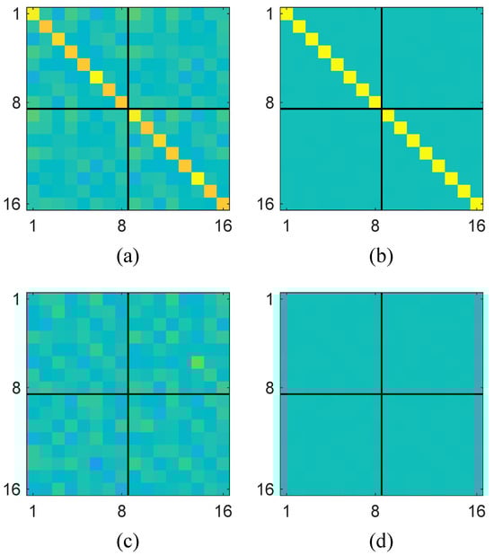 The unitization of the augmented sample covariance matrix in Equation (5) has significant advantages in spectrum sensing for noncircular PU signals. Specifically, it can contribute to learning more discriminative patterns and a generalized test statistic. To illustrate this, we consider a noncircular signal case with and , where the matrix-shaped heatmaps of the real and imaginary parts of under and are shown in Figure 2 for comparison. Herein, Figure 2a,b represent the real parts of the augmented covariance matrix under the presence and absence of the primary user signal, respectively, while Figure 2c,d show the corresponding imaginary parts. The two block matrices along the main diagonal correspond to the conventional covariance matrices, whereas the off-diagonal blocks represent the complementary covariance matrices (also known as pseudo-covariance). It is seen that the pseudo-covariance matrices (i.e., the off-diagonal blocks) exhibit a clear distinction between the cases with and without the presence of the primary user signal. This indicates that the pseudo-covariance of non-circular signals provides additional discriminative information that can be effectively used to distinguish between signal presence and absence, thereby enabling the learning of a more accurate data-driven test statistic.