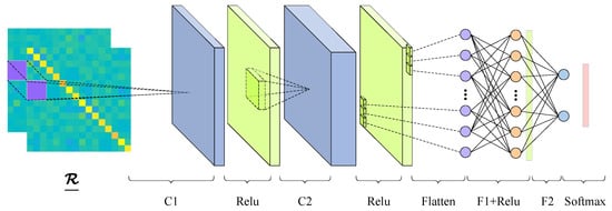 We design a CNN-based architecture composed of two convolutional layers, followed by two fully connected layers, as illustrated in Figure 3. Specifically, and denote the i-th convolutional and fully connected layers, respectively. Each convolutional layer is followed by a rectified linear unit (ReLU) activation function to introduce non-linearity and enhance the representational capacity of the network. The first convolutional layer is responsible for capturing local spatial features and correlations in , while the second layer further integrates and abstracts higher-level semantic features from the previous representations. The output of the convolutional layers is then reshaped into a one-dimensional feature vector via a flattening operation, which is subsequently passed to the first fully connected layer , with ReLU activation for further high-level reasoning. The final fully connected layer generates a two-dimensional output vector, which is passed through a softmax function to obtain the posterior probability of each class.