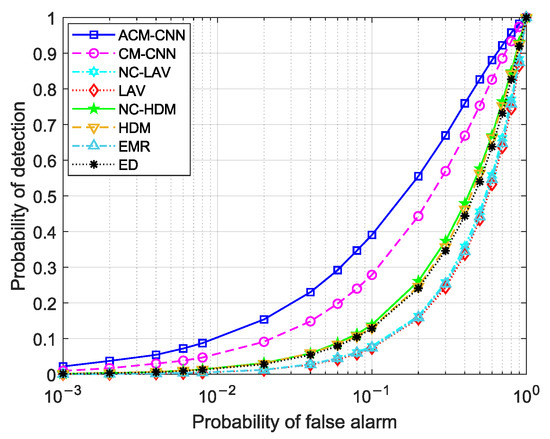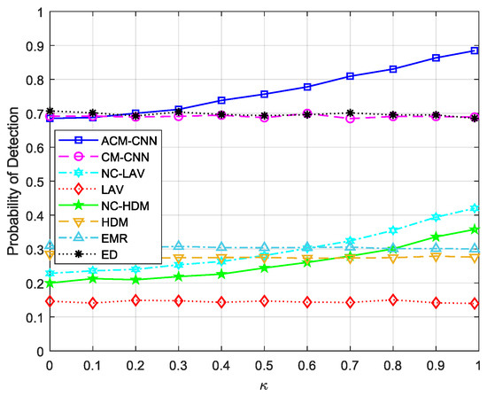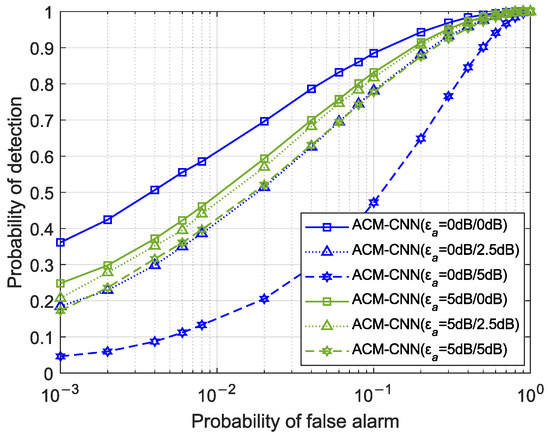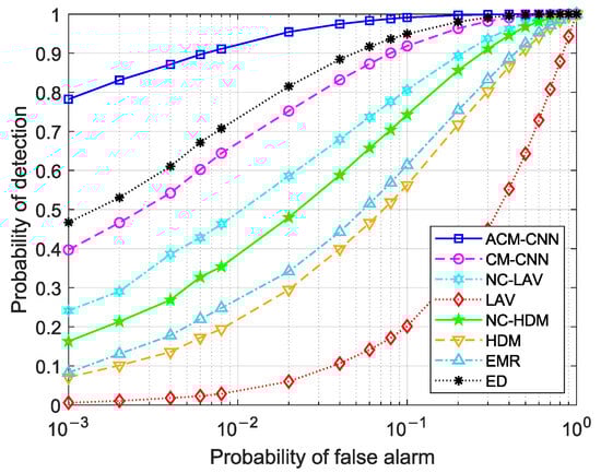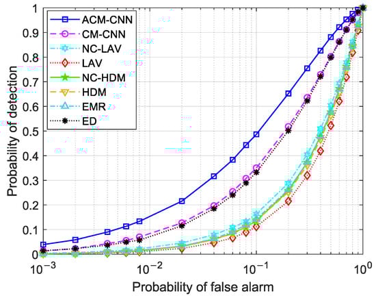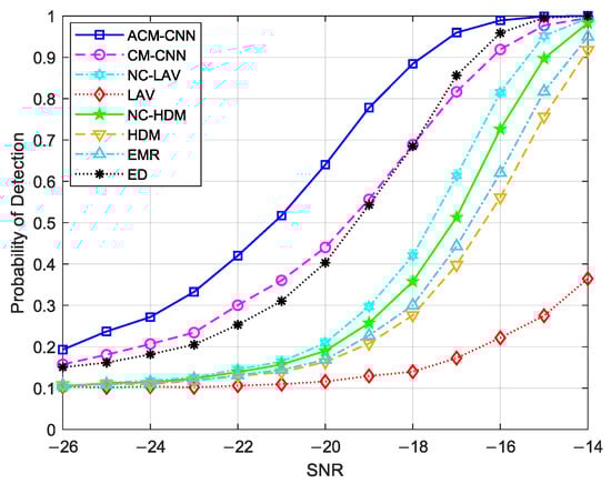 Figure 14 shows a curve of the detection probability changing with SNR under an i.i.d. noise environment with fixed . It can be seen that, under all SNR conditions, our proposed ACM-CNN algorithm was optimal.