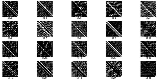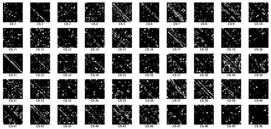To further understand how the proposed ACM-CNN model extracts discriminative features for spectrum sensing, we visualized the intermediate feature maps of the convolutional layers under hypothesis . Specifically, the augmented covariance tensor with sample size was input into the trained model, and a forward pass was performed. The output feature maps of C1 and C2 are normalized and visualized in Figure 7 and Figure 8, respectively. In the figures, “Ch q” denotes the q-th channel of the output feature map.