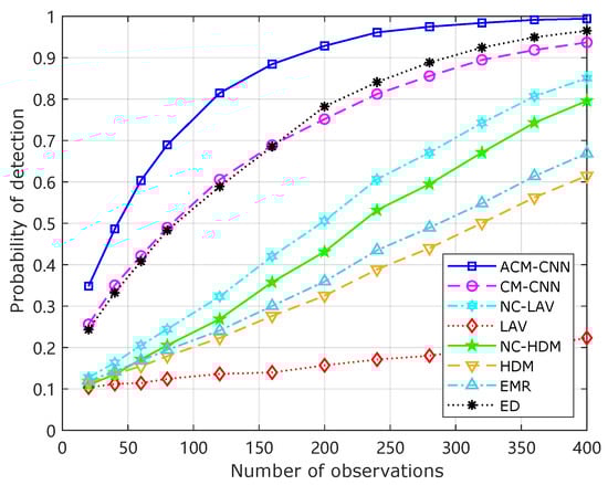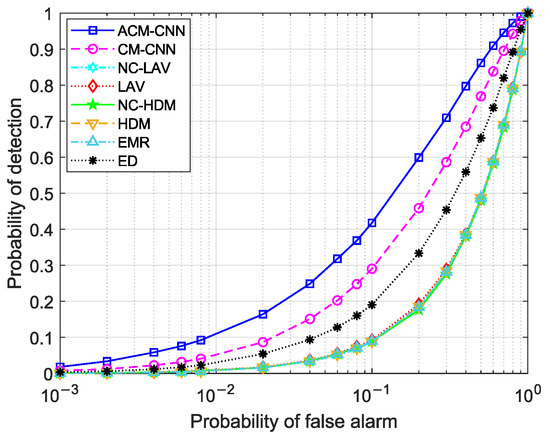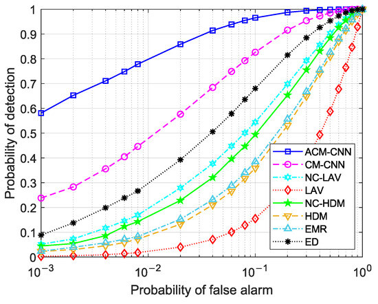 Figure 13 shows how the detection probability of the respective algorithms changed with the number of samples N when the probability of false alarm was fixed at 0.1. It can be seen that under an i.i.d. noise environment, the detection performance of all algorithms improved as the number of samples N increased. Our ACM-CNN algorithm was the best among all algorithms for all sample numbers N.