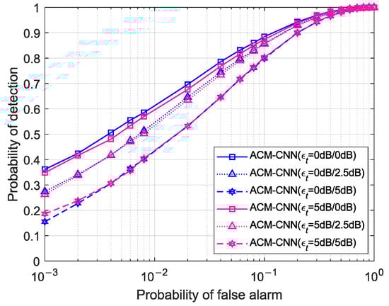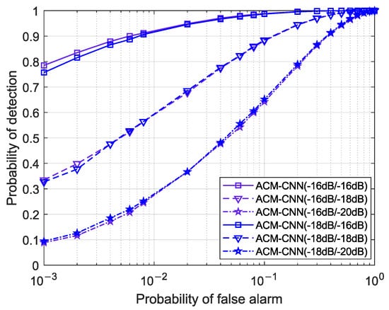 Figure 15 illustrates the ROC curves of the proposed ACM-CNN method under SNR conditions mismatched between training and detection. Specifically, “ACM-CNN ()” denotes a model trained on a dataset with SNR = p dB and evaluated on a test dataset with SNR = q dB. As observed in the figure, the detection performance remained nearly identical across models trained at different SNR levels when evaluated on the same test dataset. This indicates that our method successfully extracted signal-relevant information from the sample covariance matrix and was largely unaffected by variations in SNR. Consequently, ACM-CNN demonstrated strong generalizability and robustness to SNR mismatch between training and detection.