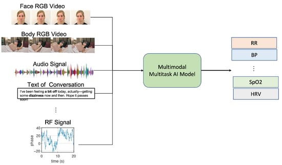 The field has evolved from early single-modality approaches, such as remote photoplethysmography (rPPG) for heart rate extraction from facial videos [4,5], to more sophisticated multi-modal and AI-enhanced systems. Early systems typically focused on extracting a single vital sign parameter through deterministic signal processing, while contemporary research increasingly aims to simultaneously monitor multiple vital signs using complementary sensing technologies augmented by machine learning [6].