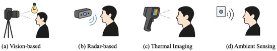 Contactless monitoring technologies encompass diverse sensing modalities that enable vital sign measurement without physical contact (see Figure 2). The primary approaches include vision-based methods analyzing color variations and motion patterns, radar systems detecting body movements, thermal imaging capturing blood flow variations, and ambient sensing leveraging environmental changes. Each modality offers complementary strengths and challenges, motivating multi-modal fusion approaches enhanced by artificial intelligence for robust real-time physiological monitoring.