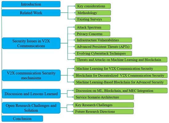 As depicted in Figure 1, the remainder of the paper is structured follows. Section 2 examines related work, comparing and contrasting its key contributions and limitations to our research. Section 3 delves into persistent and adversarial security challenges in V2X communications. Section 4 discusses various security solutions using ML and blockchain technology and their limitations as presented in the literature. Section 5 elucidates the primary objective of this survey, which is the integration of ML and blockchain. Section 6 discusses unresolved challenges and future research directions. Finally, Section 7 concludes our survey paper.