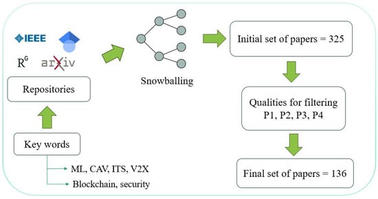 - Technological focus on machine learning and blockchain (P2): Papers covering various ML techniques that addressed anomaly detection, threat identification, or network security, giving priority to studies that focused on real-time applications and adaptability in dynamic environments. Additionally, we selected papers on blockchain applications for secure data sharing, decentralized identity verification, and integrity assurance in V2X networks, especially those tackling latency and scalability in resource-constrained environments. We also placed a focus on papers exploring the integration of ML and blockchain, either in concept or in practice.