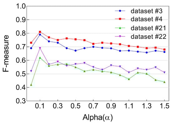 Among the three weighting strategies, the configuration derived from the Katz score consistently produced the highest F-measure values across all datasets. Furthermore, we observed that the F-measure curves for all datasets reached their peak when the threshold θ was set to approximately 0.54. This threshold appears to offer the best trade-off between precision and recall in identifying socially linked object pairs.