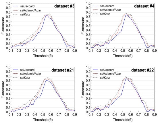 F-measure of Jaccard, Adamic/Adar, and Katz scores in terms of varying threshold θ.
