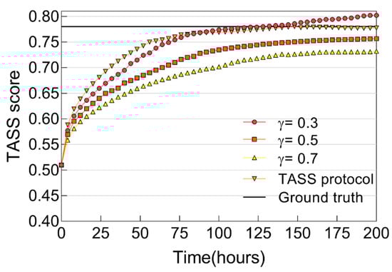 Figure 4 shows TASS score evaluation results for a trustor node toward a non-malicious trustee node that is randomly selected. Here, we can observe that trust convergence is achieved for both fixed and adaptive control. There is a trade-off between convergence time and trust bias. For a given trustor node, the former measures how quickly it reaches the ground truth TASS score, whereas the latter measures how close its TASS score is to the ground truth after convergence. In cases of static control, the trust convergence time becomes longer and the trust bias becomes smaller when a larger γ value is used. For adaptive control, on the other hand, the trustor node is able to adjust γ dynamically in order to minimize both the convergence time and the trust bias after convergence. In Figure 4, an interesting observation to note is the case where γ is too small (i.e., 0.3). In this particular case, the TASS score is over-estimated upon convergence, which certainly is not a desirable trait as trust overshooting is considered detrimental to the stability of any trust management system. Our TASS protocol, however, adjusts the value of γ dynamically for fast convergence without incurring the trust overshooting phenomenon.