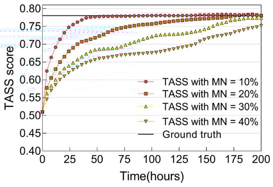 The next experiment tests the resiliency of the proposed TASS protocol against a malicious node population. In particular, we evaluate how the TASS score for a trustor node toward a well-behaved trustee node change with respect to varying percentages of MN. In Figure 5, we can observe that as the population of malicious nodes increases, both the convergence time and trust bias increase. However, the TASS protocol is found to be resilient to various malicious attacks for MN up to 40 percent, with the graph illustrating proper trust convergence and accuracy behaviors. Overall, we observe that the trust bias is kept at a minimum when MN  40%. Therefore, this depicts the resiliency property of the proposed TASS protocol against malicious attacks in SIoT.