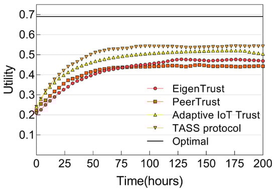 Figure 6 shows the ns-3 simulation results showing the utility scores of IoT service composition with MN = 20%. We observe that the trust-based service composition with our TASS protocol significantly outperforms random service composition and upon convergence approaches the performance of ideal service composition based on ground truth. Furthermore, our TASS protocol outperforms EigenTrust [], PeerTrust [], and adaptive IoT trust [] as the underlying trust protocol for trust-based service composition. Finally, we also observe that the performance gap widens as the percentage of MN increases.