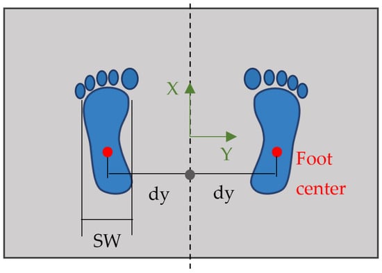 Once the global CoP has been calculated, it is necessary to assume certain conditions during the tests in order to be able to split it into two separate components: both feet must be placed in fixed, known positions, situated at equal distances (dy) from the X-axis of the platform to the midpoint of each sole, as shown in Figure 1, and the sole width (SW) must also be known. The Kistler coordinate system is used, since it is the most widely used in the field of biomechanical applications.