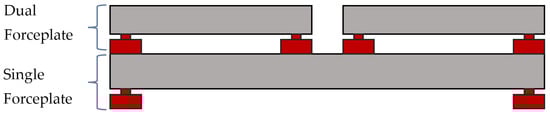 To validate this analytical hypothesis, a double forceplate device has been developed that allows the simultaneous measurement of each individual foot’s CoP and ground reaction forces applied and the global CoP and reaction force. This methodology enables the comparison of the global CoP behavior with the individual CoP behavior of each foot during a test. The device comprises two forceplates: a single forceplate placed underneath and a dual forceplate located on top of the first one, as illustrated in Figure 2 and Figure 3.