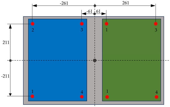 The sensors of the upper forceplates are in close proximity to the corners of each plate; their locations can be seen in Figure 4. The right plate sensors are located in symmetrical positions with respect to the Y-axis. In an analogous way, the sensors of the lower forceplate are located near the corners of the plate, directly below the four sensors at the outer corners of the two upper plates.