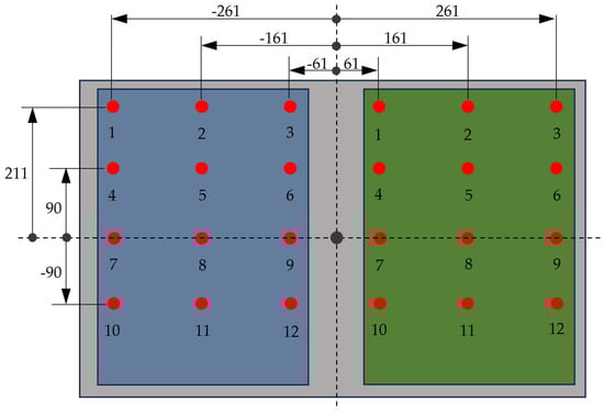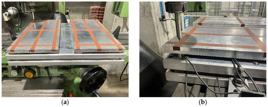 To verify the accuracy and ensure the consistency of the results obtained with both plates, the device was placed on a milling machine worktable equipped with a special tool to apply force mounted to the chuck (Figure 5), allowing loads to be applied at precise locations with an error margin of ±0.01 mm. With this setup, a load between 200 N and 1000 N was applied at twelve different points on each of the two upper plates (see Figure 6), enabling the assessment of the error produced by each forceplate.